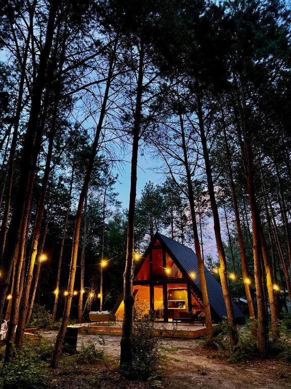 PAPROTKA – DOM I LAS to domek o powierzchni 70m2, który znajduje się na działce otoczonej sosnowym lasem, w miejscowości Kiełpiny. Odwiedzający to miejsce goście odnajdą tu ciszę i spokój. Duże okna i przeszklenia sprawiają, iż można poczuć się częścią lasu. Z końca działki widoczne jest Jezioro Kiełpińskie. Obiekt oferuje komfortowy wypoczynek o każdej porze roku. Minimalistyczny wystrój w pełni wkomponować się w leśną scenerię. PAPROTKA – DOM I LAS to przede wszystkim dużo drewna, przestronny salon z kominkiem, w pełni wyposażoną kuchnia, miękka kanapa, dużo poduch, mała czytelnia, planszówki, przytulna sypialnia oraz nowoczesna łazienka. Na dużym tarasie (45 m2) można cieszyć się poranną kawą, a wieczory spędzać przy gazowym grillu pod gwiazdami. Ten obiekt to idealne miejsce dla tych, którzy pragną uciec od zgiełku miasta, zrelaksować się i odnaleźć harmonię z naturą.