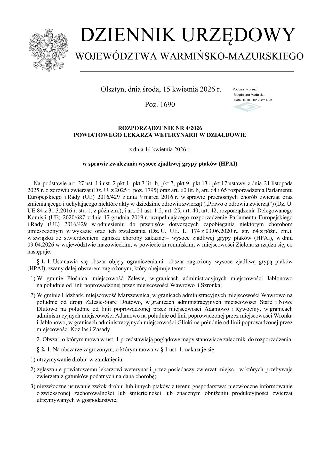 ROZPORZĄDZENIE NR 4/2026 POWIATOWEGO LEKARZA WETERYNARII W DZIAŁDOWIE z dnia 14 kwietnia 2026 r. w sprawie zwalczania wysoce zjadliwej grypy ptaków (HPAI)
